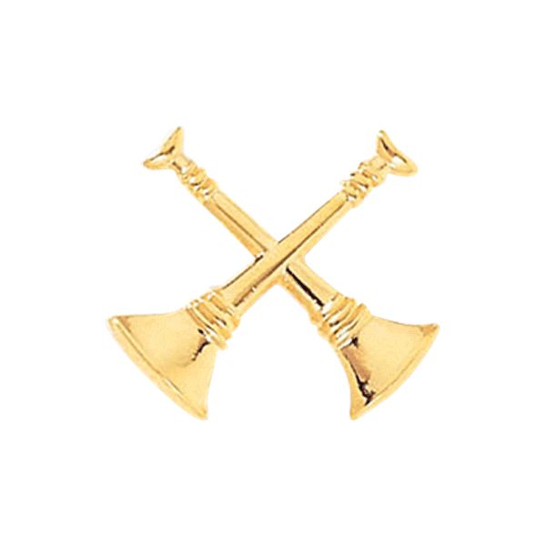 Exquisite polished 2 crossed horns. This piece will really POP in presentation on a uniform!