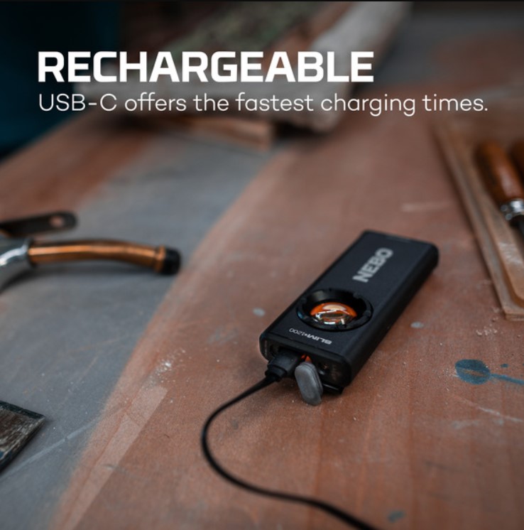 - Need a reliable yet portable lighting tool that will fit in your pocket? Then check out this SLIM+ 1200 Rechargeable Pocket Light by NEBO. It’s more than just a flashlight; itÕs a powerful, compact, and ready on-the-go tool for illumination, signaling, or charging. Built particularly for those who need serious lighting versatility in a pocket-sized package. Ideal for technicians, repairmen, mechanics, plumbers, or even DIY enthusiasts.SLIM+ features a unique side-positioned button to allow easy and complete control of the different light modes. Just press and hold to toggle between options: whether you want the eye-popping Turbo mode, pushing out 1,200 lumens for short bursts, or a low, steady glow for up to 12 hours. No worries either if you need red lighting, with its Direct-to-Red function youÕre just one press away from subtle and night-vision-friendly illumination. It also has a red laser mode which can come in handy for precision tasks and signaling.